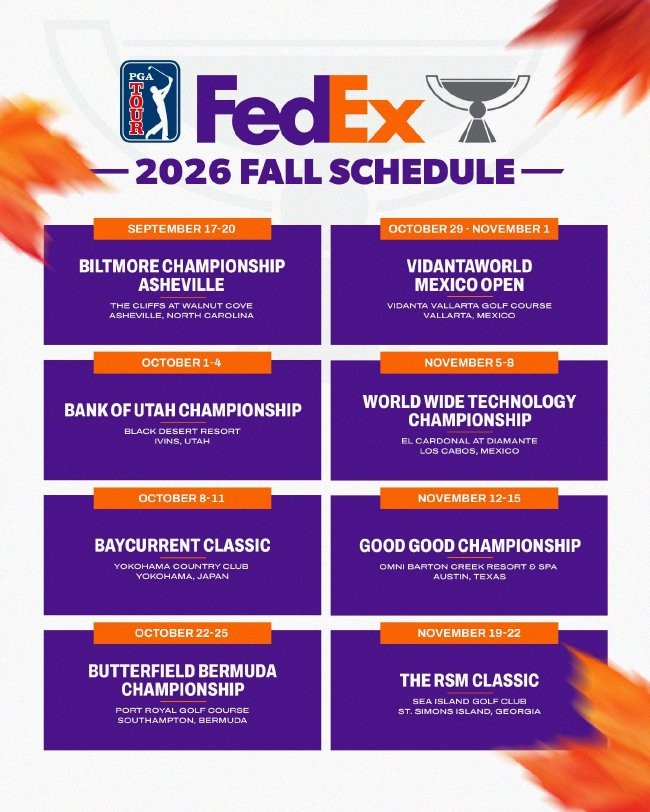 秋季系列赛将新增北卡罗来纳州阿什维尔与得克萨斯州奥斯汀两站赛事。两站这两站赛事将取代自1968年起常年举办的取消密西西比桑德森农场锦标赛,以及可追溯至2007年联邦快递杯创立之初的美巡加利福尼亚州纳帕普罗科锦标赛。